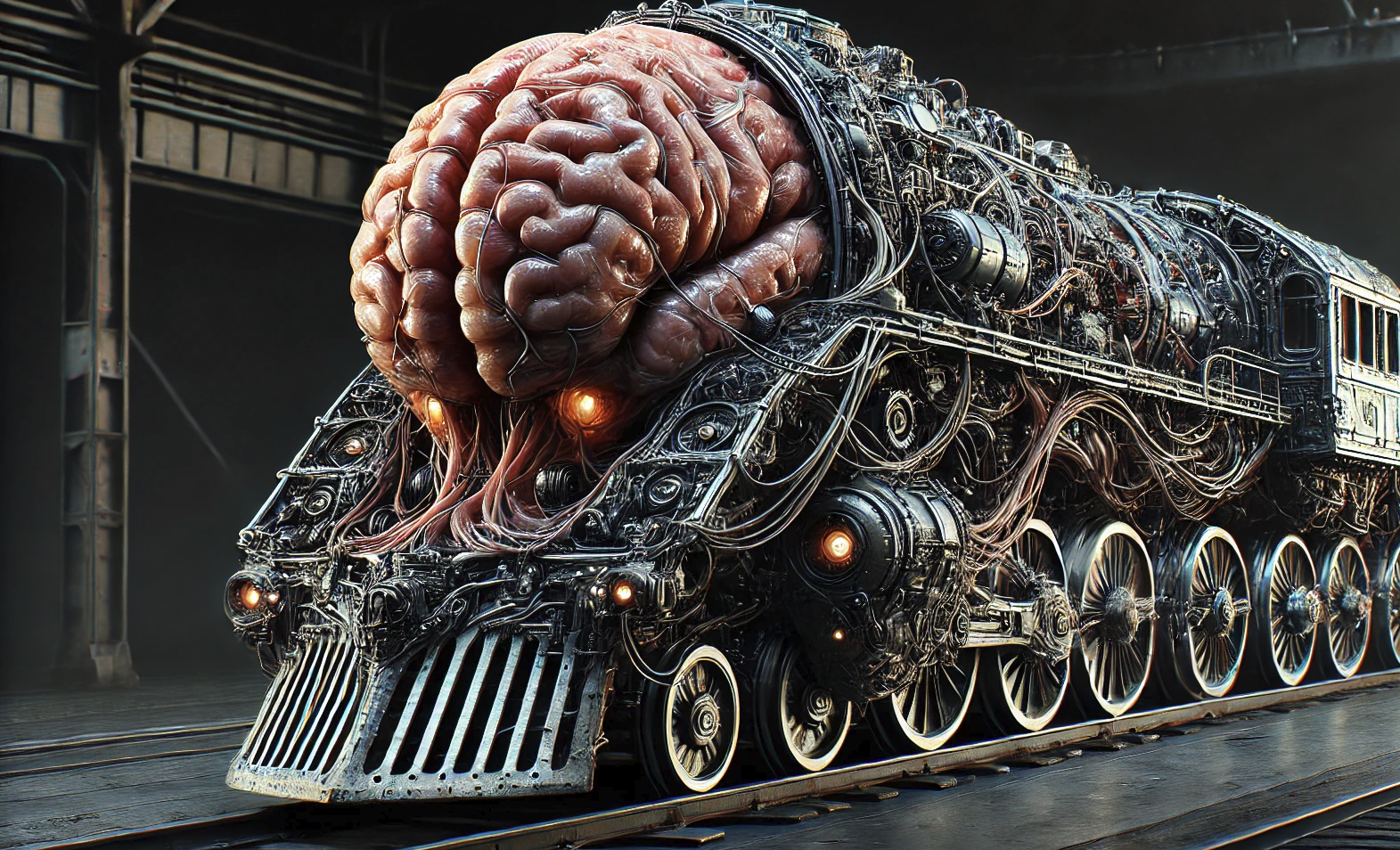 The heart of the train is a fusion of machinery and pulsating organic matter. Massive gears interlock with tendons, and a dark, viscous fluid drips fromt he ceiling, pooling on the floor. The air is thick with the smell of burning oil and decaying flesh.